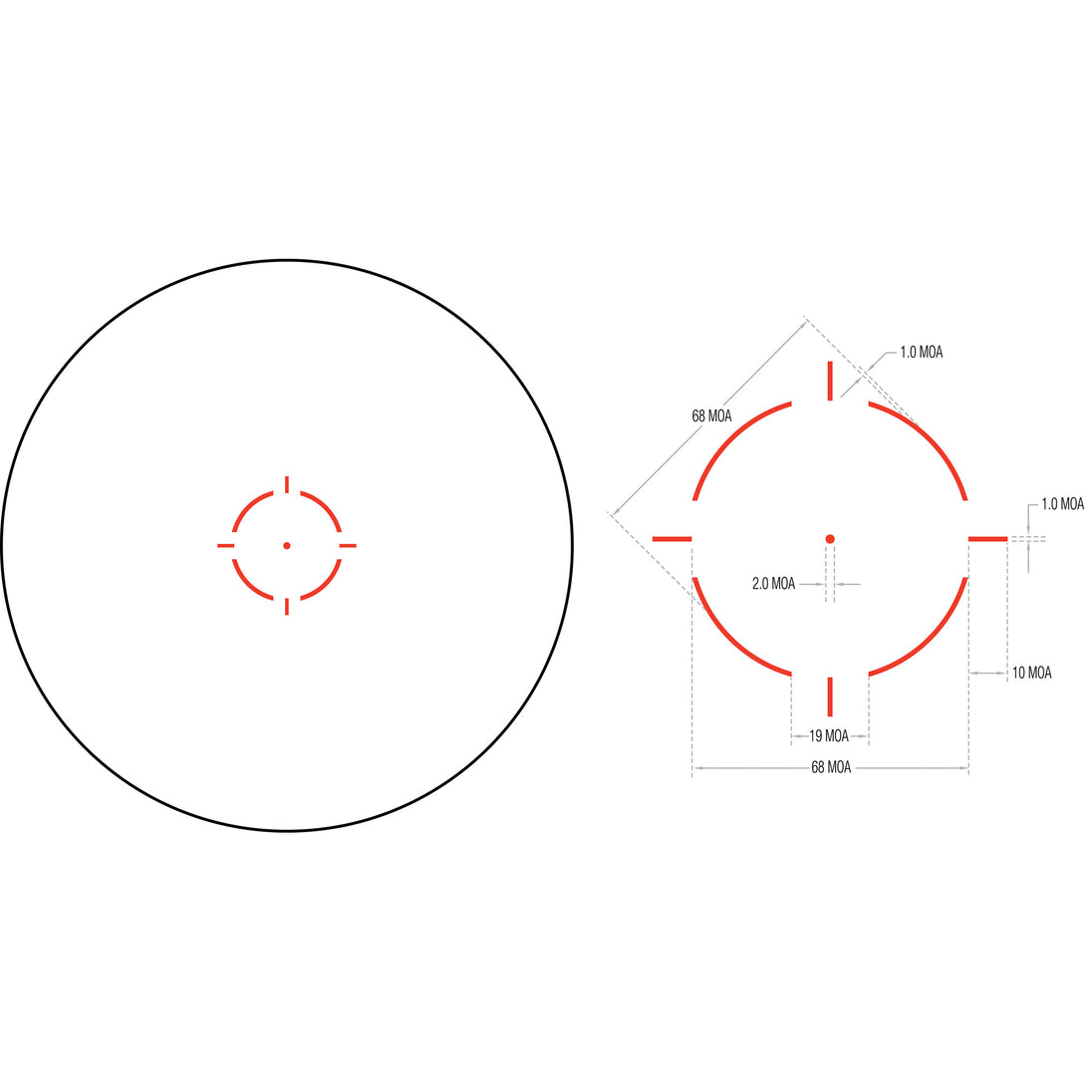 The Trijicon Miniature Rifle Optic (MRO) is a reflex-style, sealed sight intended for use on rifles, carbines, and shotguns to provide fast target acquisition. It is designed to be used with both eyes open, providing the operator with maximum situational awareness. The large aperture and tapered light path maximizes the viewing area in such a small optic, allowing for fast target engagement - especially from non-standard shooting positions. It also features ambidextrous brightness controls, sub-flush adjusters, advanced lens coatings, and a fully sealed, waterproof, hard anodized forged 7075-T6 housing, making the MRO the ultimate mini reflex sight. The MRO HD is optimized for use with a magnifier, with a re-engineered objective lens to produce a refined 2.0 MOA center dot surrounded by a 68 MOA segmented circle reticle. The ambidextrous reticle and brightness control allows the user to choose between a full reticle or center dot only.