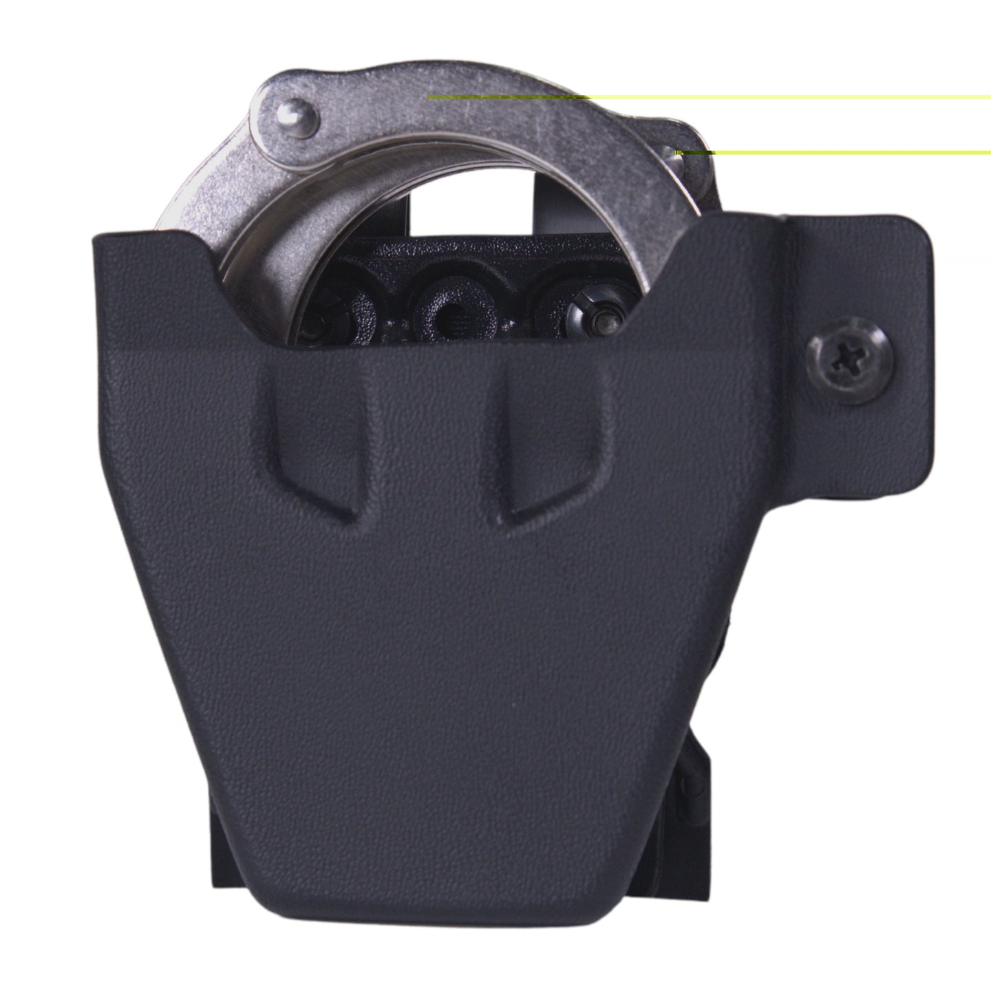 The Uniform Line Handcuff Carrier is a Kydex pouch designed to hold specific make/models of handcuffs such as the ASP Ultra, S&W Hinged, and S&W Chain cuffs. It is retention adjustable to properly secure cuffs based on users preference. It has a flared top that lets the user more easily insert handcuffs into the pouch. It comes shipped either with HSGI universal clips, or a dedicated PLM belt mount option. Also has a hole pattern that allows for diverse mounts and cants with other Comp-Tac accessories.